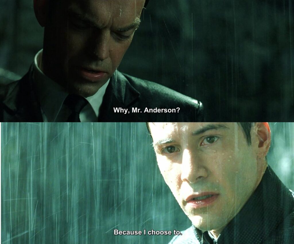 Sahne ilerleyişi boyunca hitap şekli, sistemin insan üzerindeki kontrolünü simgeleyen araç olarak kullanılmaktadır. Ajan Smith karakteri, mekanik konuşma tarzı aracılığıyla otorite hissi oluşturmaktadır. Bu yaklaşım, anlatının felsefi yönünü güçlendiren detaylar arasında yer almaktadır. Film çözümlemelerinde bu diyalog üzerinde durulmaktadır.